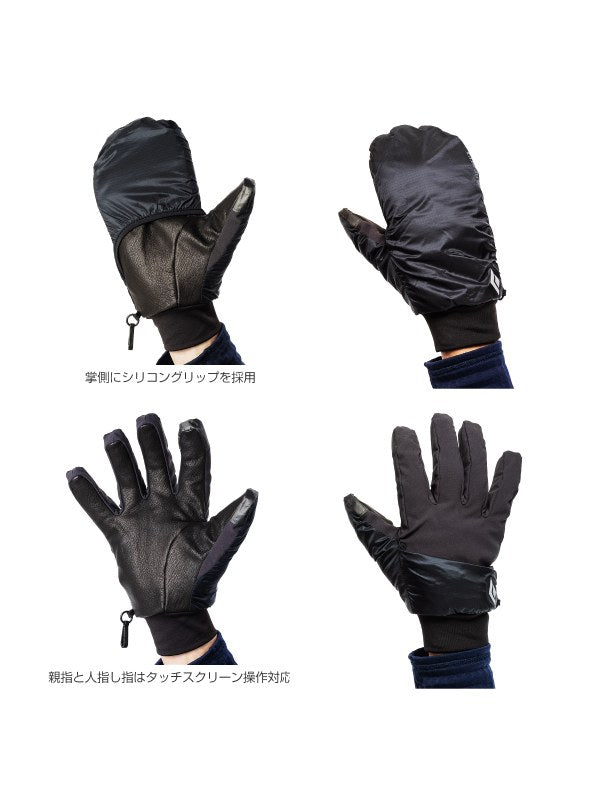 Soft shell glove with a hood that can be tucked into the instep to protect against wind and snow.