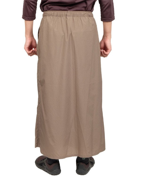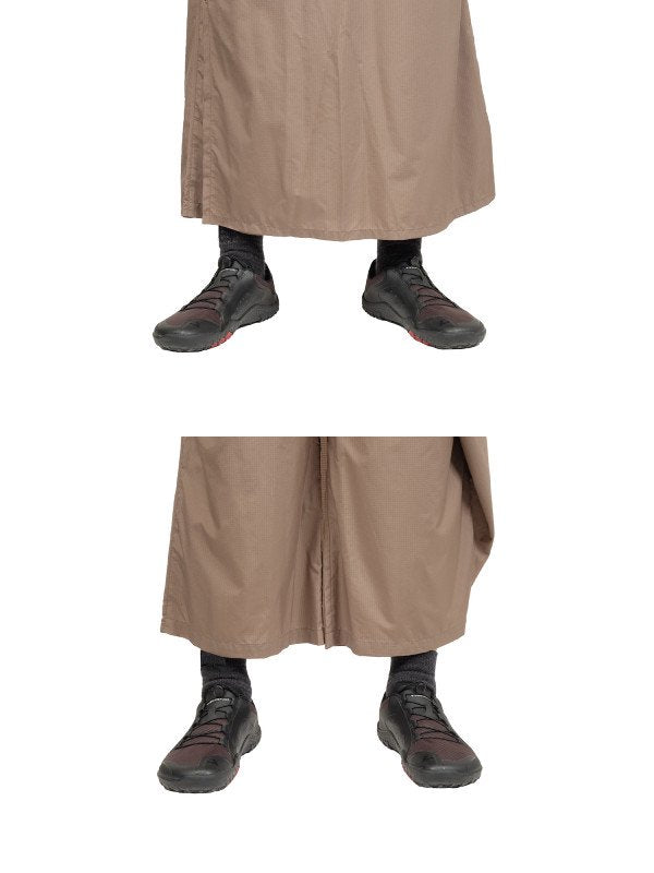 急斜面では自分で裾を踏んでしまうことがあるので、裾を端折るようにスナップボタンで止めてください。