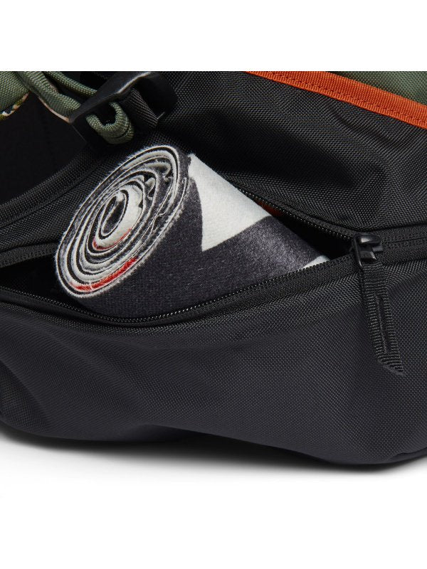 大型のヒップベルトはクライミングスキンの収納に便利。アタッチメントを使ってスキー、スノーボード、ヘルメット、ピッケルなどを外付けできます。