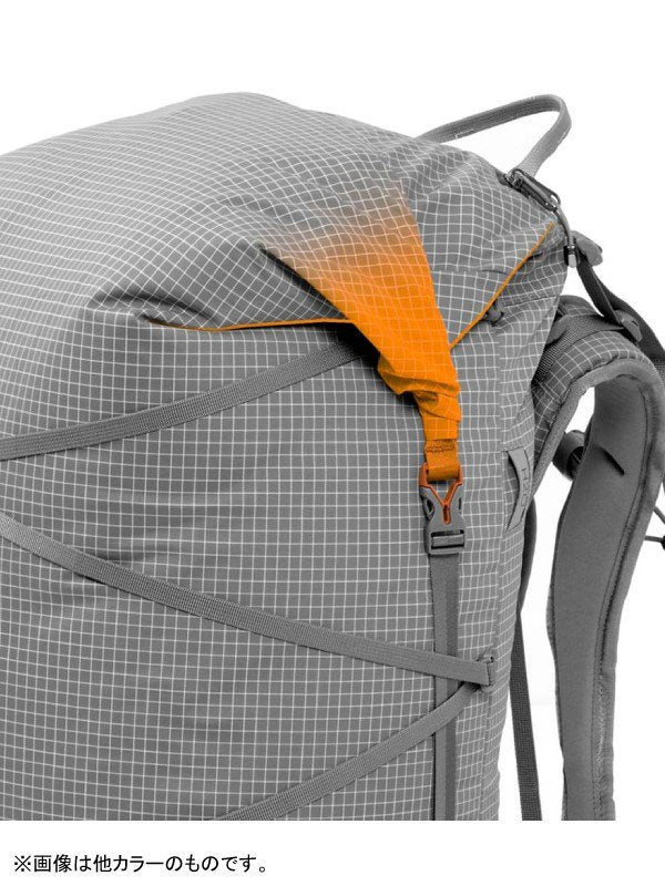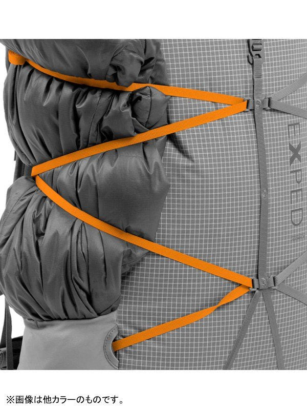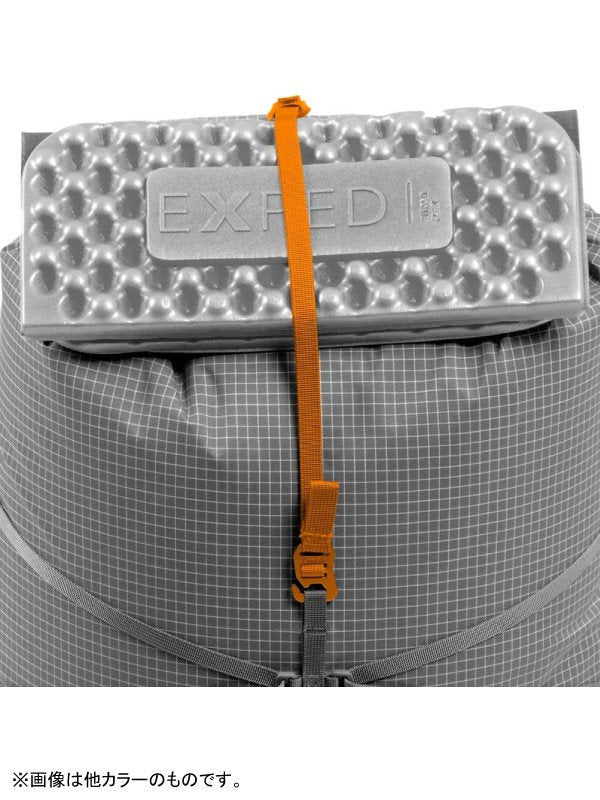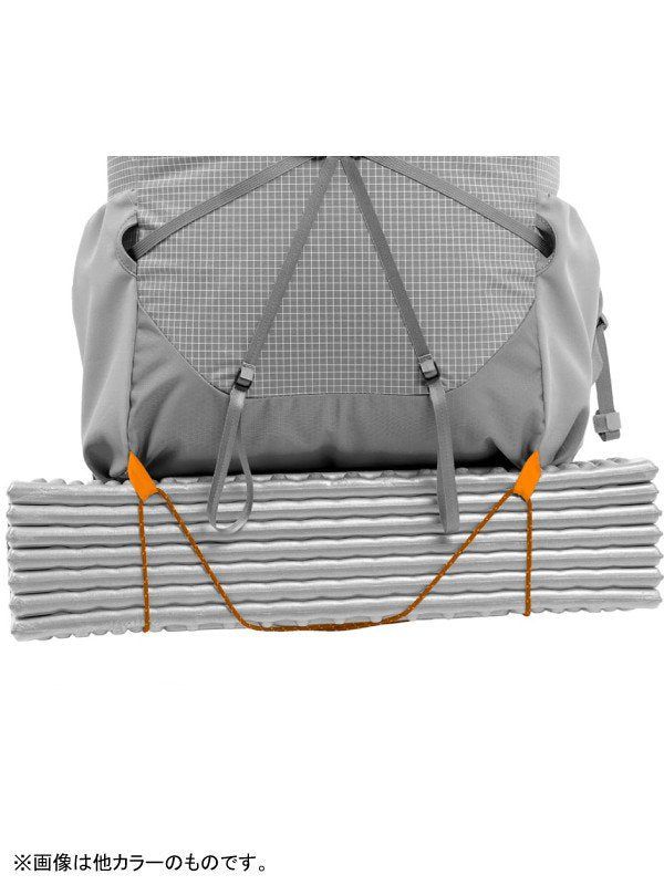 ジグザグのサイドコンプレッションストラップとRapideフック付きのストラップが荷物をザックに固定します。