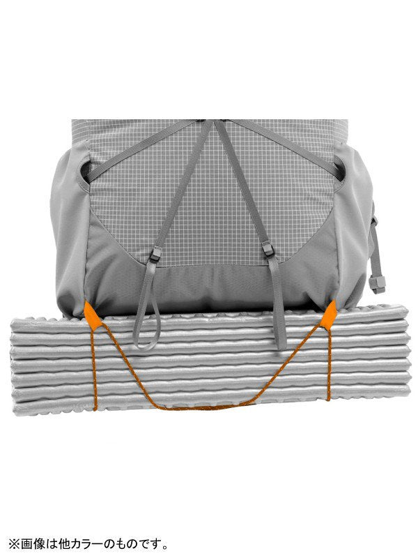 ジグザグのサイドコンプレッションストラップとRapideフック付きのストラップが荷物をザックに固定します。