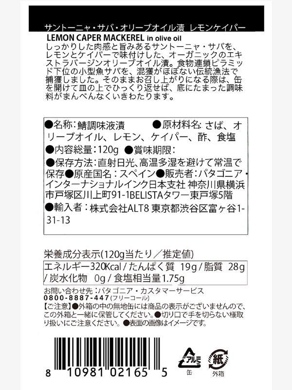 パタゴニア サントーニャ・サバ・オリーブオイル漬 レモンケイパー