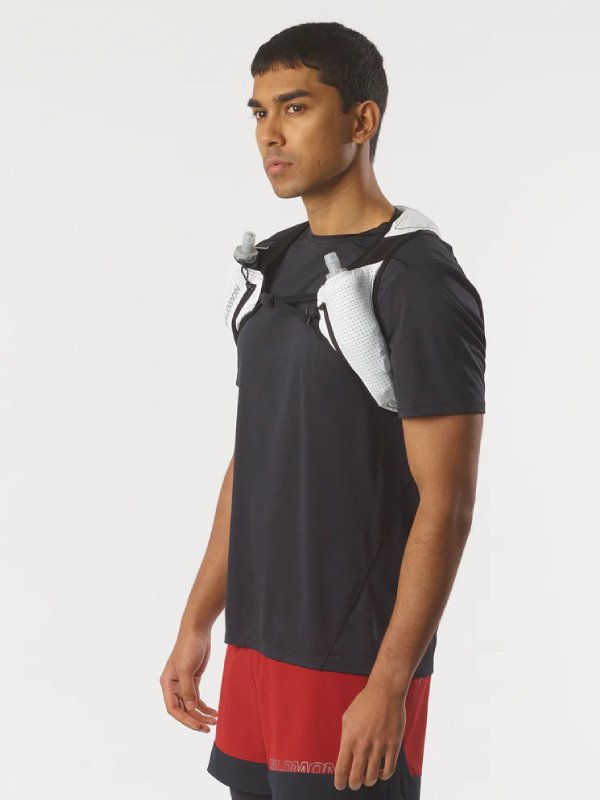 Salomon のソフトフラスクにフィットし、弾みを抑えたフロントポケット。伸縮性のある上部ループでフラスクを固定でき、飲みやすい作りになっています。