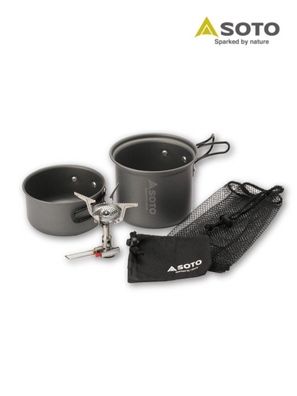 トータルバランスに優れたコンパクトストーブ、SOTOシングルストーブ AMICUS(アミカス)とアルミクッカーのセット。