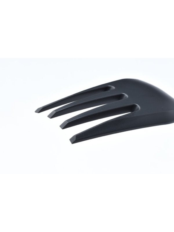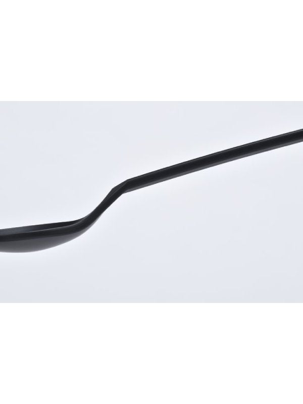 アウトドア用樹脂カトラリーは、ハンドルとヘッド間をストレートに設計した物が多いのですが、本品はそこに角度を付け、お皿へのアプローチがしやすい形状を追求しています。