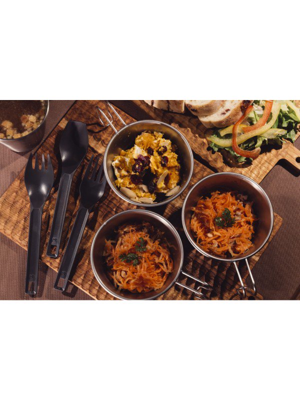 金属のお皿が多いアウトドアには、接触音が出ない樹脂カトラリーが最適。