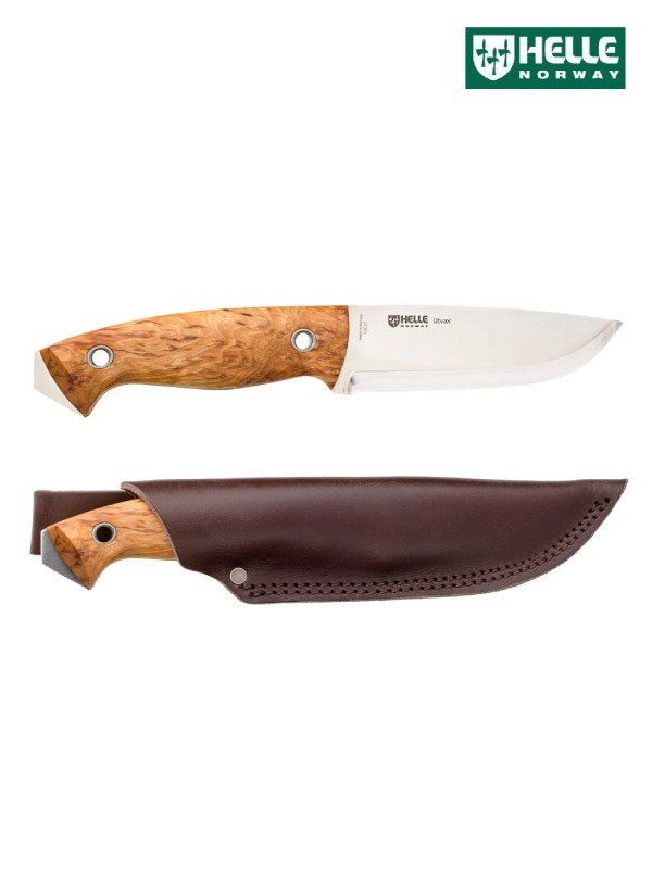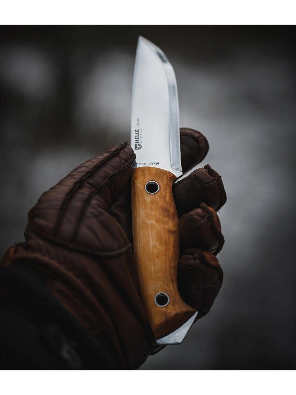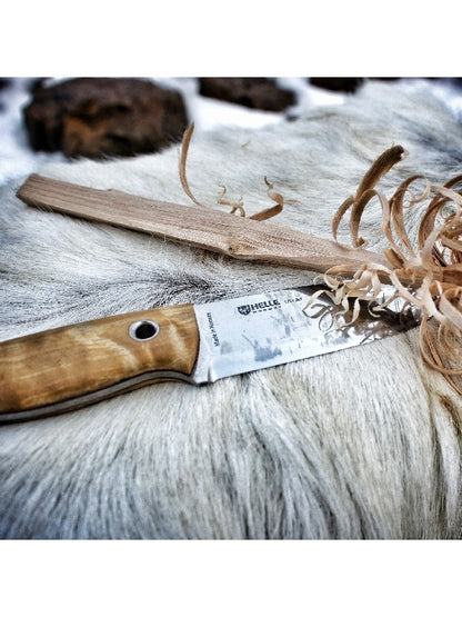 バトニングなどの切断はもちろんの事、ヘレナイフの他のフルタングモデルと比べて刃長が102mmと少し短く作られているので、取り回しがしやすいので軽く行うカービングナイフとしても使いやすいです。また、ユートゥベーラは、ブレードの幅が広く、刃先からポイント(切先)にかけてのアール(そりの部分)の立ち上がり角度が強くなっているので、ハンティング後のスキニングなどでも本来の力を発揮してくれます。