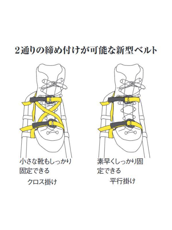 ポリウレタンデッキベルトにより、湿気の多い雪のときでも足下に雪団子がつきにくい。