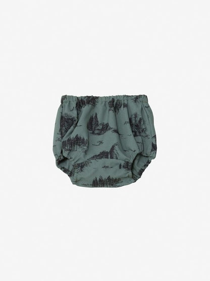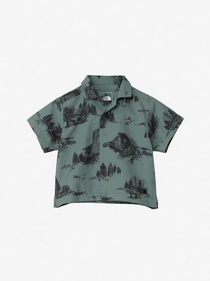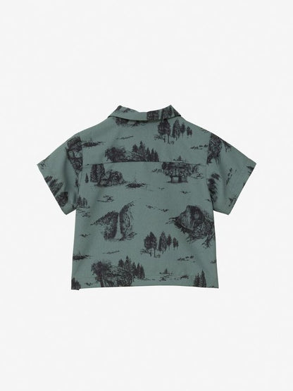 開襟シャツはフロントが着脱しやすいドットボタン仕様。パンツはおむつの上から着用ができるバルーンシルエットです。ヨセミテの風景や山などをヴィンテージ風にアレンジしたグラフィックの「ヨセミテトワレニュートープ」カラーと、無地のマウンテンブルーの2色。グラフィックデザインは大人共通で、親子でお揃いのコーディネートが楽しめます。ギフトにも適したアイテムです。