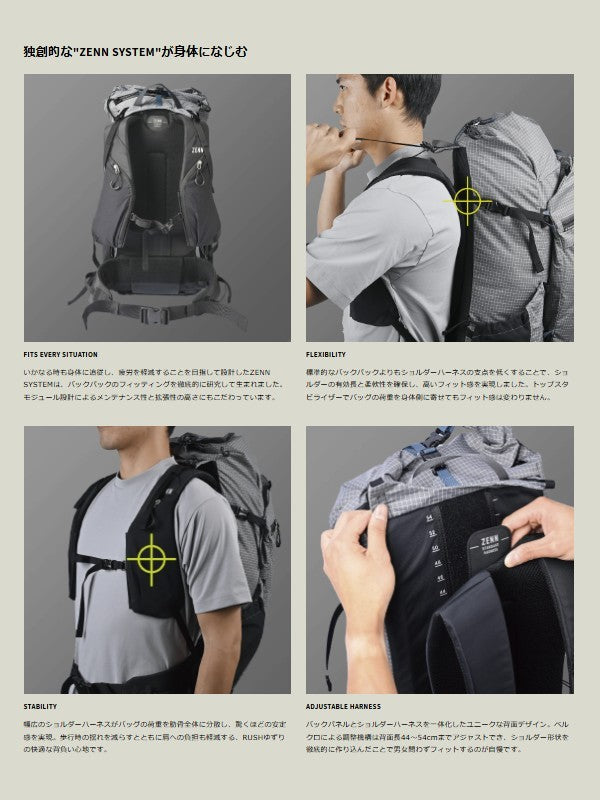 いかなる時も身体に追従し、疲労を軽減することを目指して設計したZENN SYSTEMは、バックパックのフィッティングを徹底的に研究して生まれました。モジュール設計によるメンテナンス性と拡張性の高さにもこだわっています。
