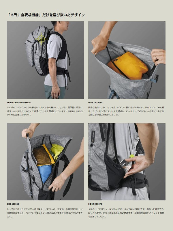アルパインザックのような細身のシルエットを基本にしながら、肩甲骨の周辺にボリュームを持たせることで荷重バランスを最適化しています。RUSHとBUDDYゆずりの高重心設計です。