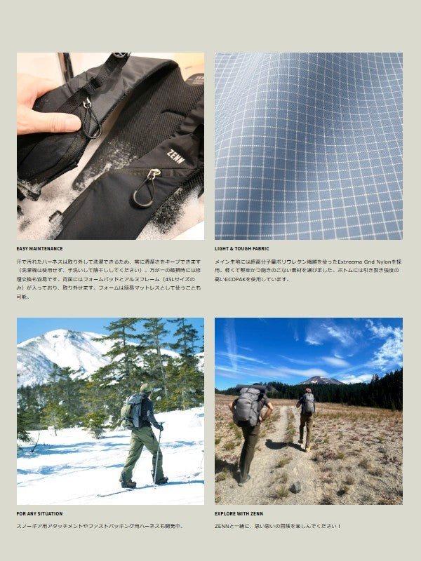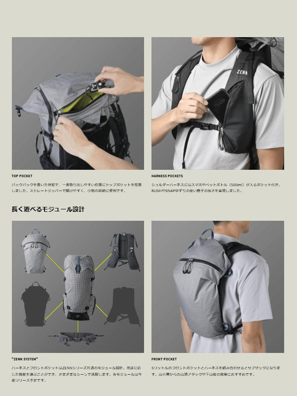 ハーネスとフロントポケットはZENNシリーズ共通のモジュール設計。用途に応じた機能を選ぶことができ、さまざまなシーンで活躍します。各モジュールは今後リリース予定です。